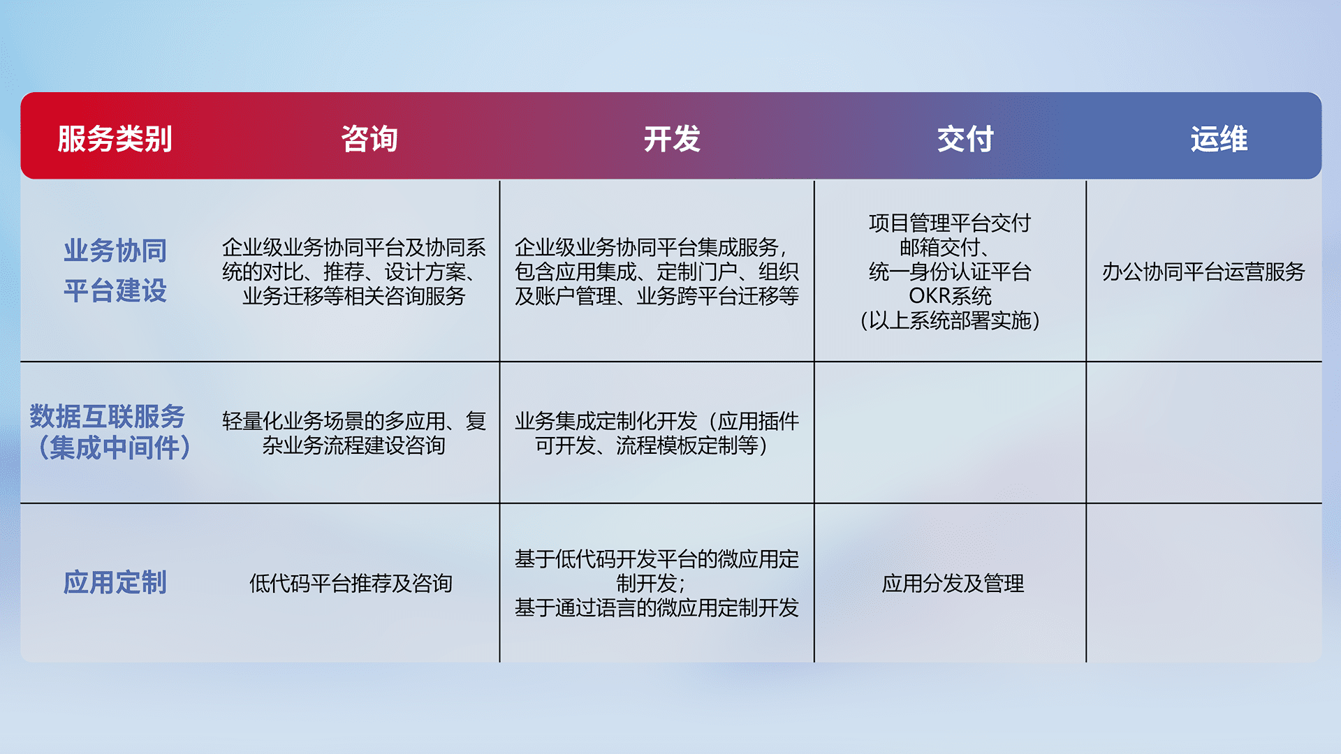 针对钉钉、、企微、、IDaas等平台级产品提供产品的规划、、、方案、、、、交付、、定制化开发等服务,,,实现如统一协同办公、、、、智能客户服务、、、、混合会议管理、、智能数据查询、、、、等业务场景,,,,实现数字化转型。。。。